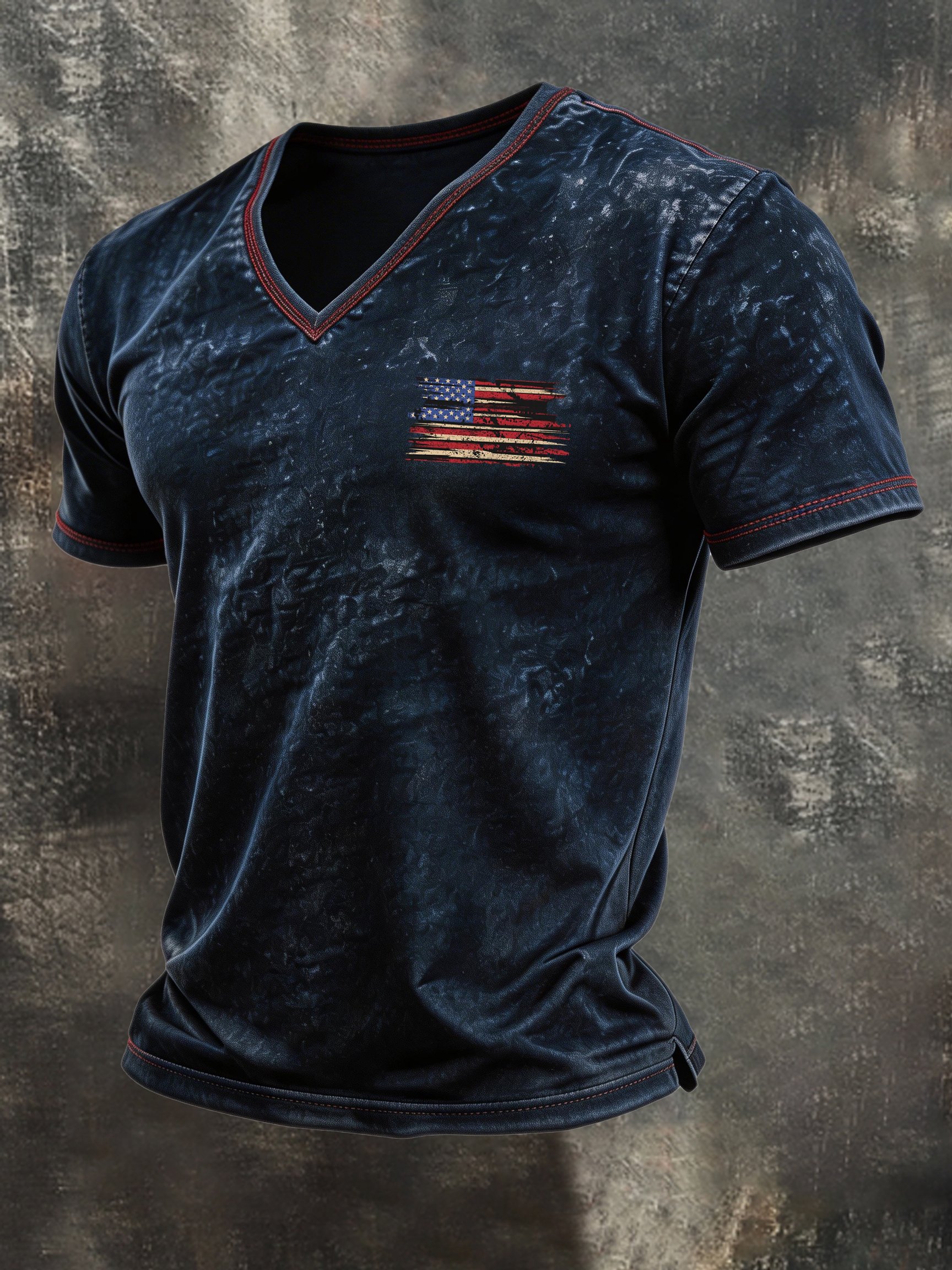 Men's Vintage Distressed Washed Patriotic V-Neck Short-Sleeve T-Shirt